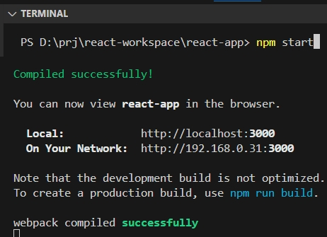 7. npm start 명령어를 입력 후 서버를 실행하면 localhost:3000번 서버가 실행됩니다.
