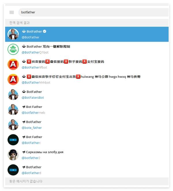 2. botfather을 검색창에 입력 후 맨 위에 파란 딱지 붙은 아저씨를 선택합니다.