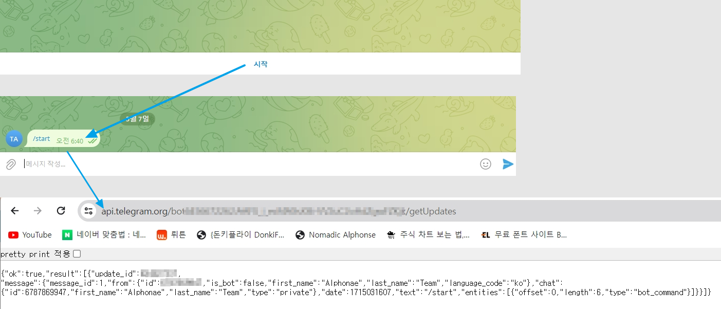 10. 자신의 username링크를 클릭하고 들어오면 시작 버튼이 보입니다. 클릭하고 /start가 떴다면 이전에 접속했던 api주소로 재접속해봅니다. 그러면 처음과 달라진 결과를 확인하실 수 있습니다.
