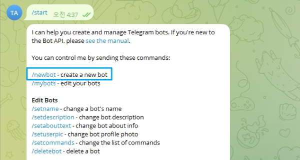 3. 새로운 봇을 생성하기 위해서 newbot을 클릭합니다.
