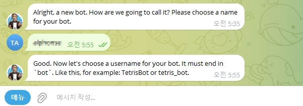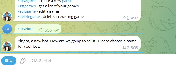 4. 새로운 봇에 이름을 정하라는 메시지가 나옵니다.