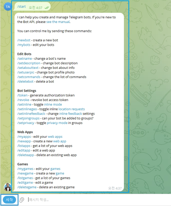 2. 아래에 보이는 시작버튼을 클릭하거나 입력창에 /start라고 입력하면 아래와 같은 창이 뜹니다.