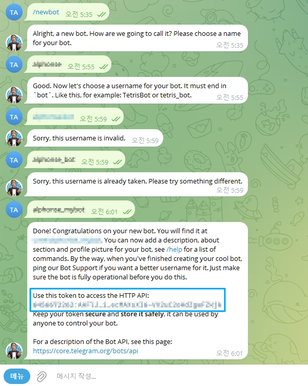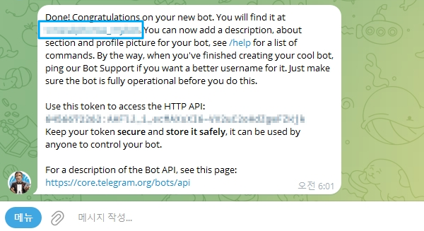 9. 자신의 username이 적힌 링크 부분을 클릭합니다. ex) test_mybot