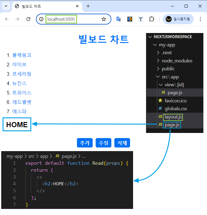 주의: Next.js에서 라우팅이 제대로 작동하도록 하려면 'page.js'라는 고정된 이름을 사용해야 합니다.