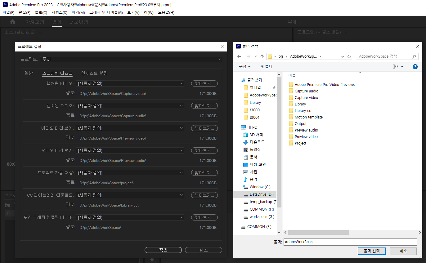 D 드라이브에 'AdobeWorkSpace' 디렉터리를 생성하고, 이곳에 서브디렉터리를 추가하여 모든 기본 디렉터리 경로를 변경해 줍니다. 이렇게 하면 작업 파일과 캐시를 보다 효율적으로 관리할 수 있습니다.