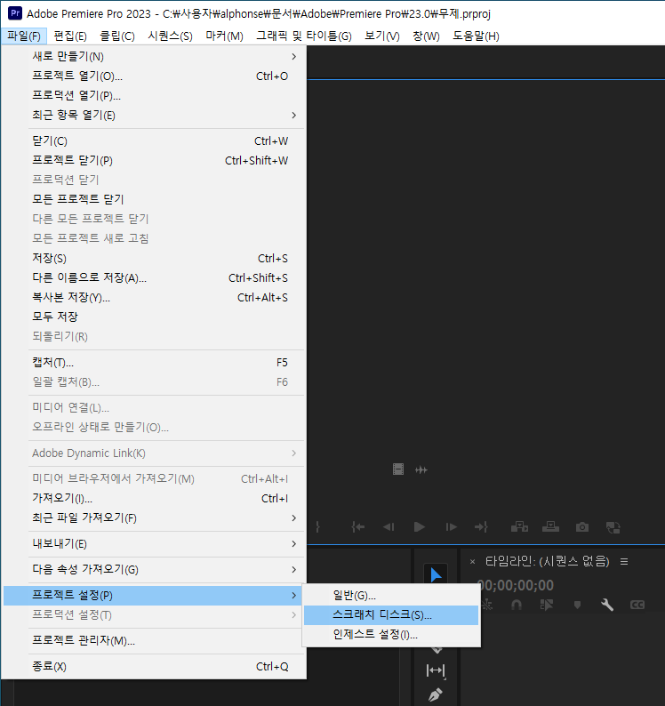 설치 후 프로그램을 처음 실행하면 Adobe Premiere Pro는 기본 설정된 경로에 프로젝트 파일과 캐시 등을 저장합니다. 이 경로는 대부분 사용자의 C 드라이브에 설정되어 있는데, 작업 파일의 용량이 크게 늘어날 수 있으므로, 다른 드라이브로 변경하는 것이 좋습니다.
