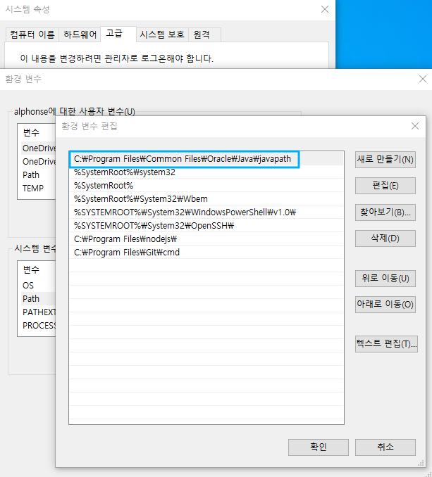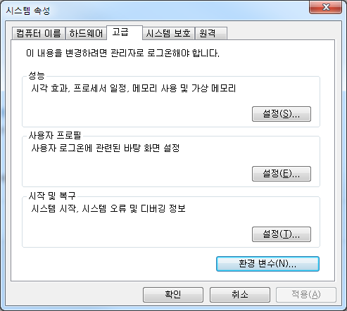 1. 윈도우 메뉴 > 설정 > 고급 시스템 설정 > 환경변수로 이동합니다.