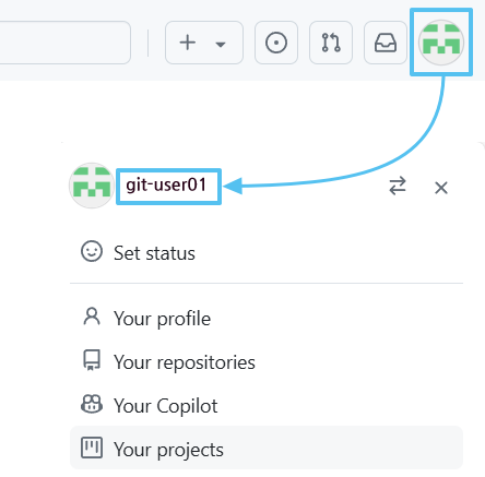 GitHub에 접속했을 때, 우측 상단의 아이콘을 클릭하면 사용자명 정보를 확인할 수 있습니다. 이 예시에서는 git-user01 계정을 사용하고 있습니다.